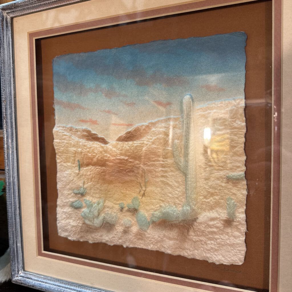 Vintage 1993 Hand Cast Paper handmade art by FIGI GRAPHICS, San Diego, CA. Desert art scene is framed in a solid wood shadow box style with double matting. Piece is signed and has original tag. MINT condition. 13" x 13" x 1.75" D.