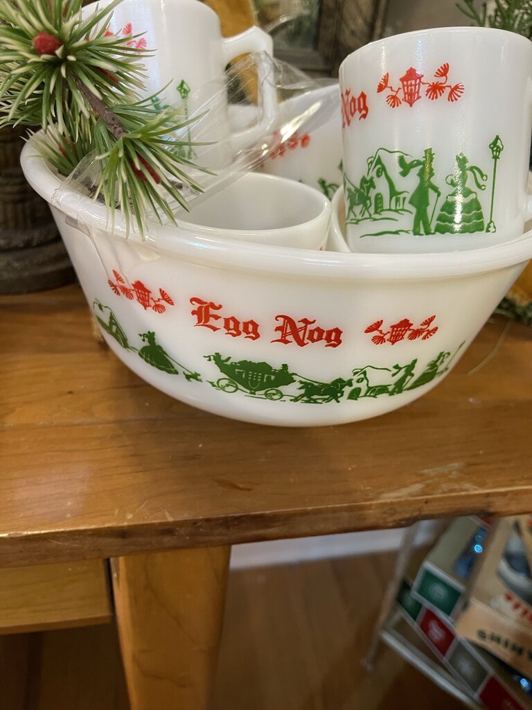 Vintage Hazel Atlas Milk Glass Tom & Jerry punch bowl and 6 cups as is
