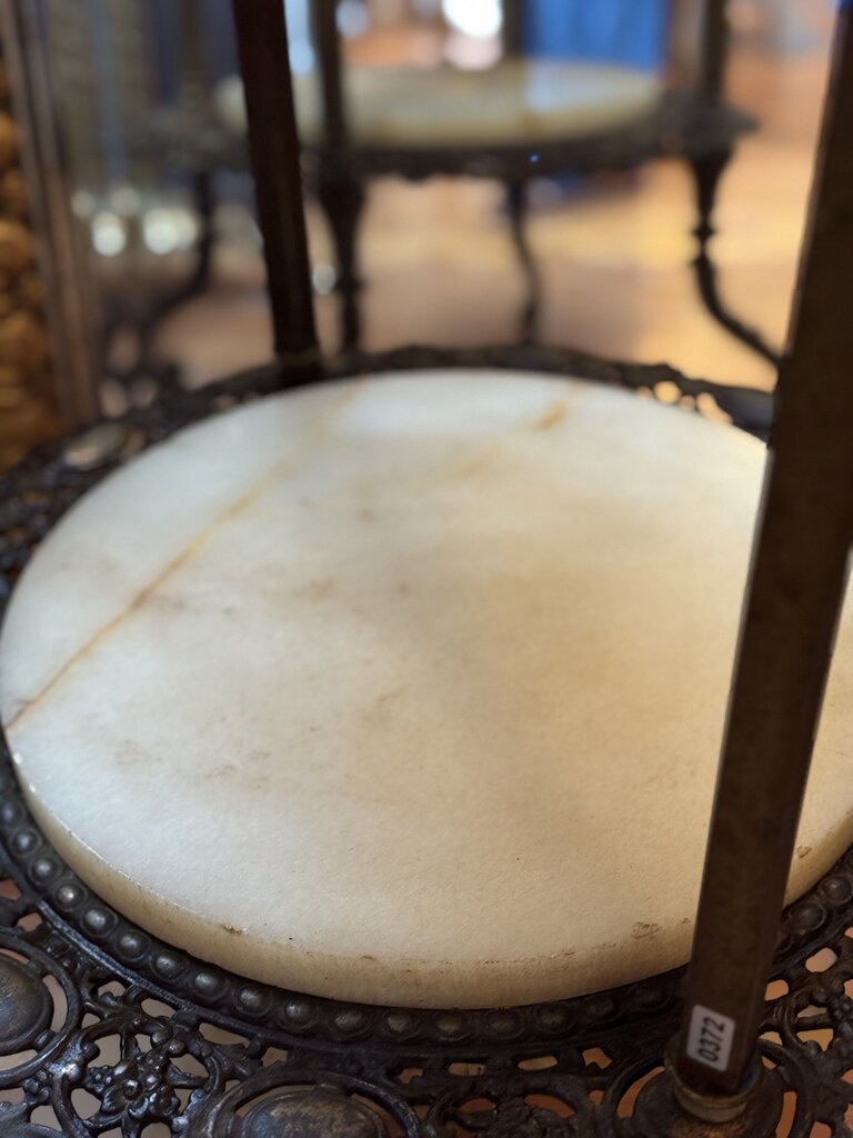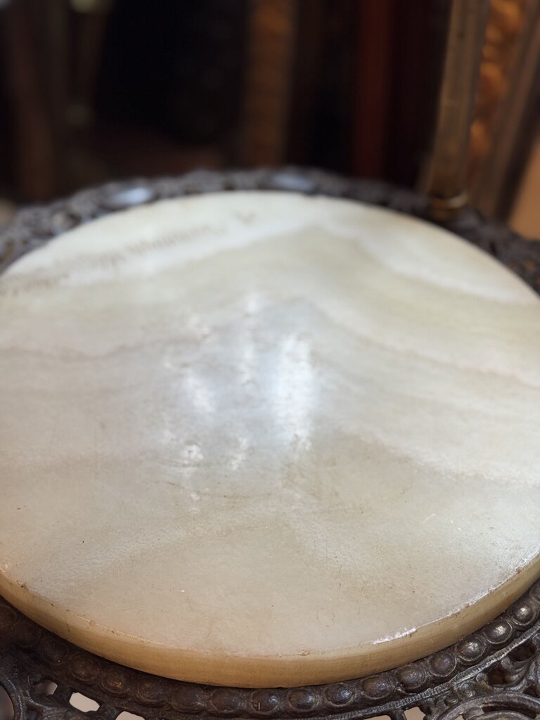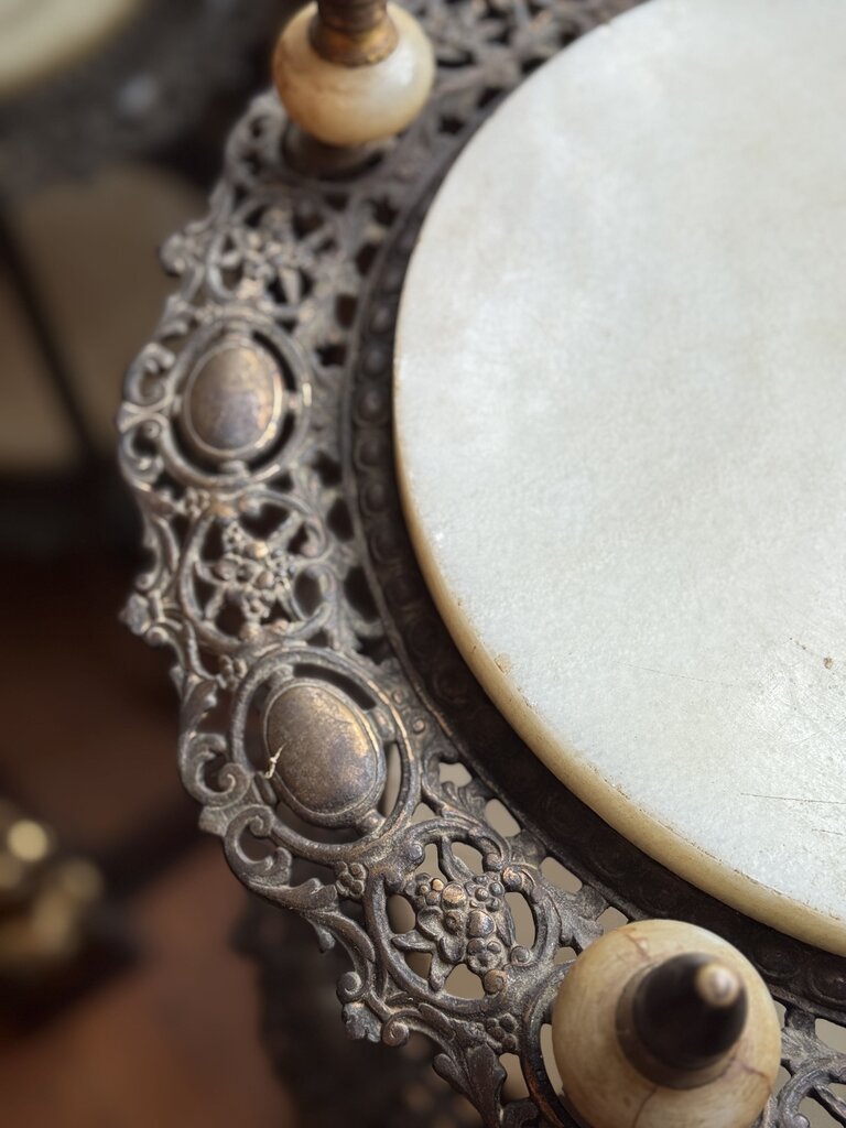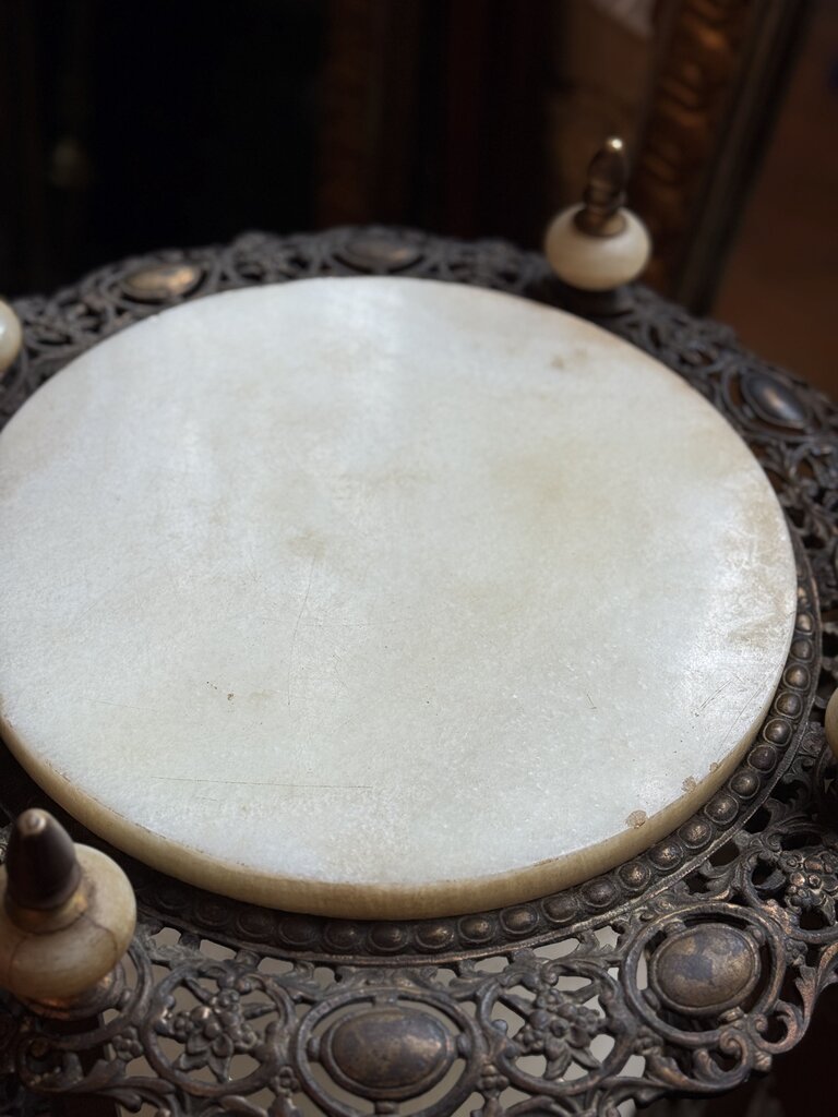 Could be polished for bright brass. Minor chips and wear, one leg needs to be tightened. Overall good condition. Local pickup only