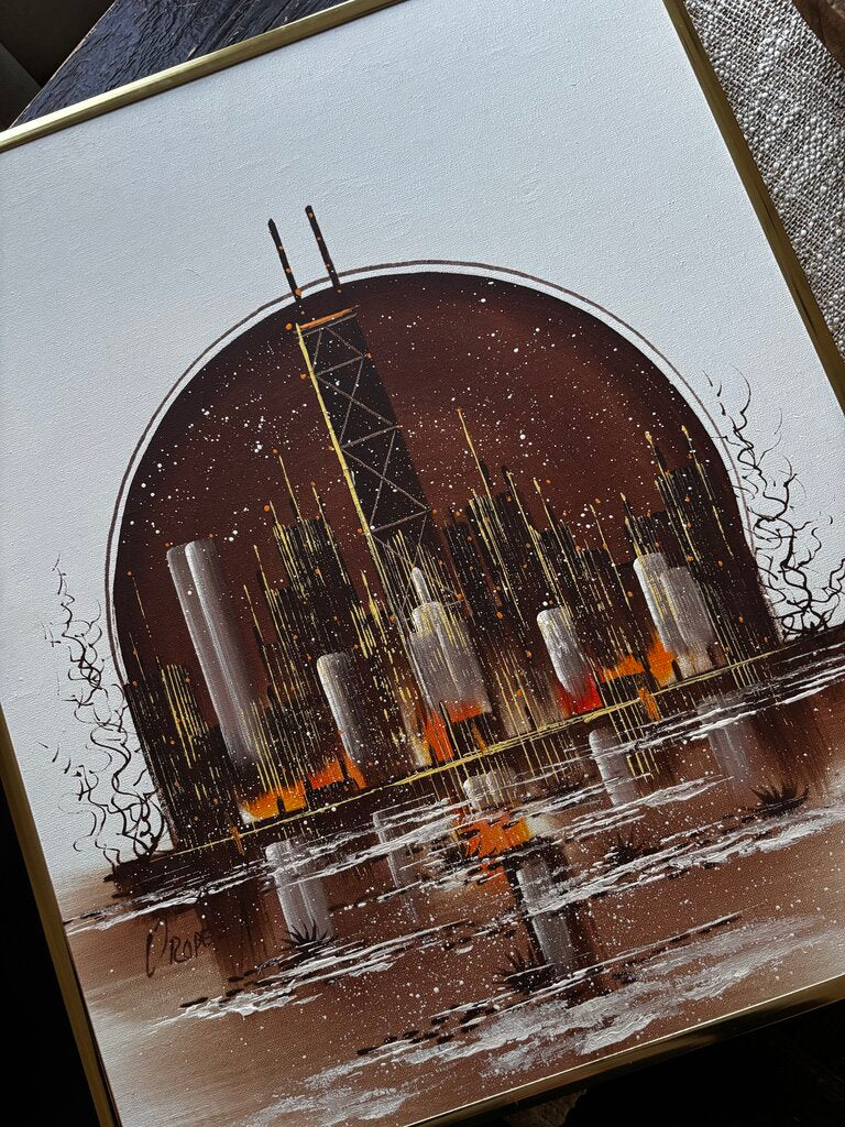 EDUARDO OROPEZA Mid-Century Modern Chicago Skyline Oil on Canvas 24.5 x 20.5