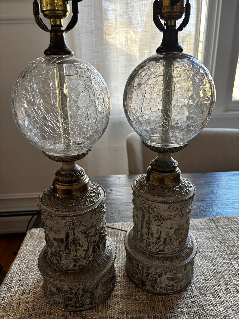 Pair of Vintage Brass Table Lamps w/ Crackle Glass Spheres