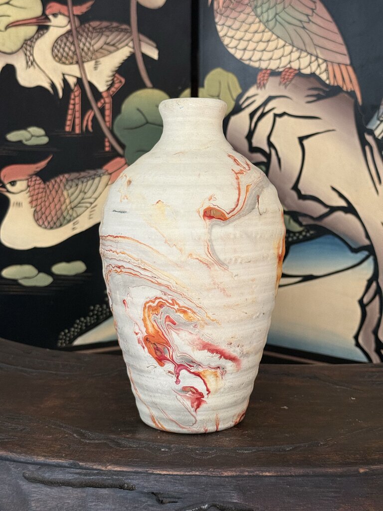 L- Nemadji tall ribbed vase orange red gray glaze 9 tall x 5 wide