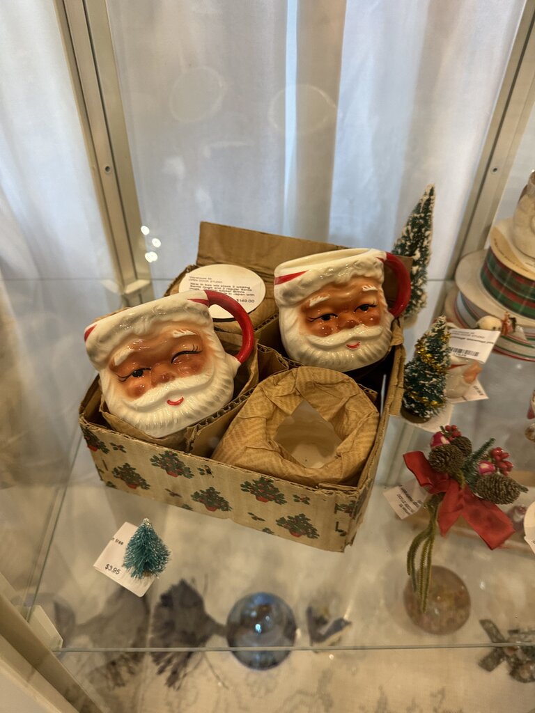 New in box old stock 2 winking Santa mugs and 2 regular Santa mugs. Original sticker Brinns Ceramics PA made in Japan with box