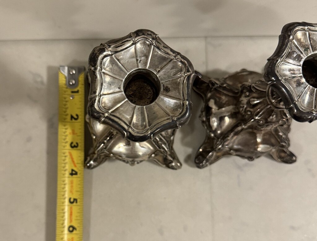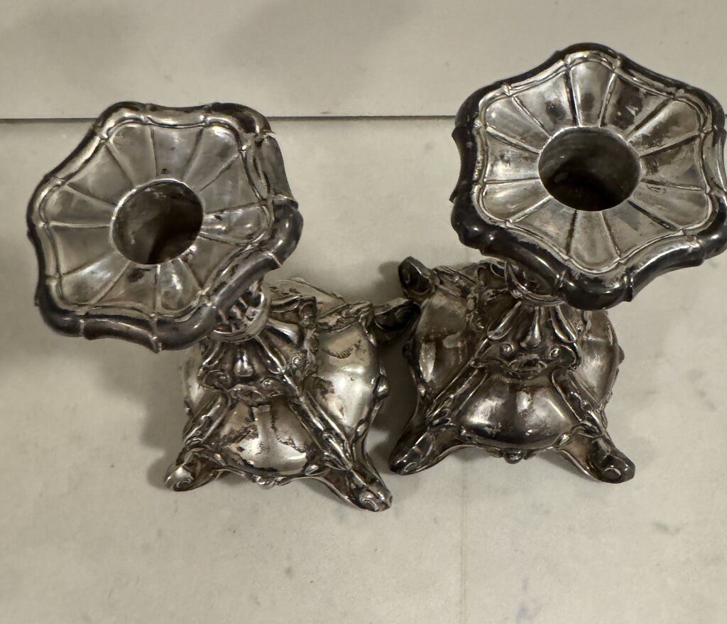 Sweden weighted sterling rococo style 6" tall 3.5" wide at base (pair) three crowns and "s" hallmark